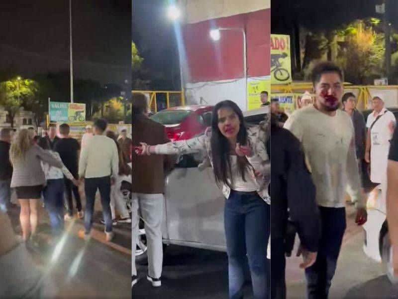 En otros video se observa a la mujer con su ropa manchada con sangre y herida de la nariz, al igual que su pareja, además de que ya hay presencia de la policía de la Ciudad de México.
